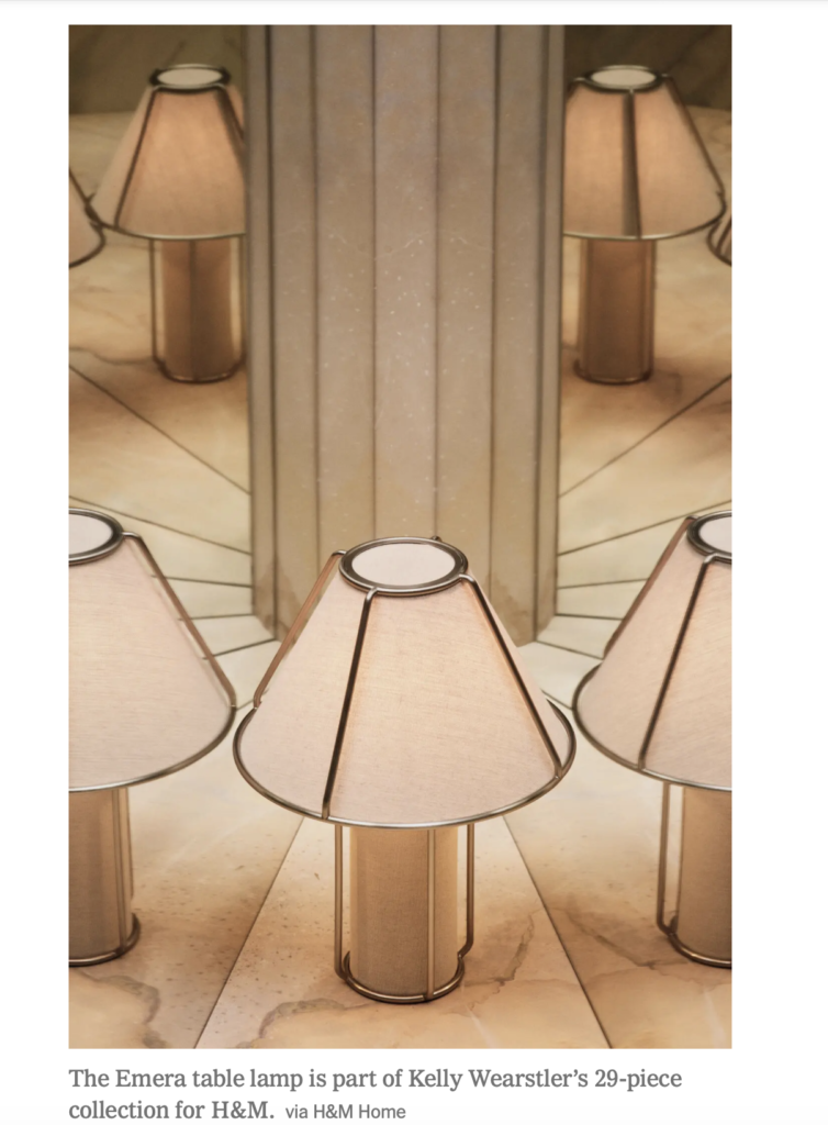Kelly Wearstler is making her Milan Design Week debut this year, not, as might be expected, with a luxury brand or a prestigious design gallery, but with the home-goods division of the global fashion brand H&M. Several items from the Los Angeles designer’s 29-piece collection — which includes furniture, lighting, textiles, tabletop items and accessories — will be presented at Palazzo Acerbi, a 17th-century Baroque palace in the Porta Romana neighborhood that is not as a rule open to the public. Ms. Wearstler always wanted to show in Milan, she said, “but I wanted to do something really exciting and big.” More here.
